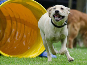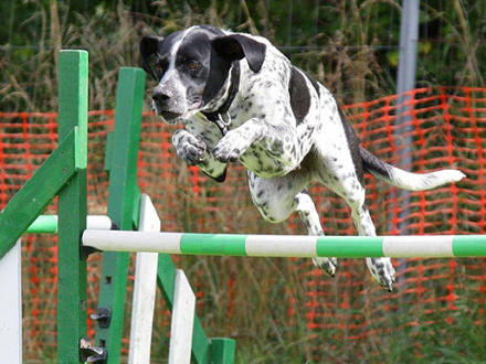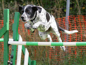 directs a dog through an obstacle course,