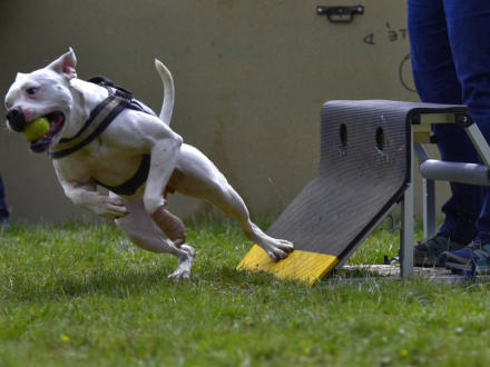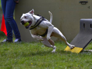 FLYBALL is a relay dog sport where teams of